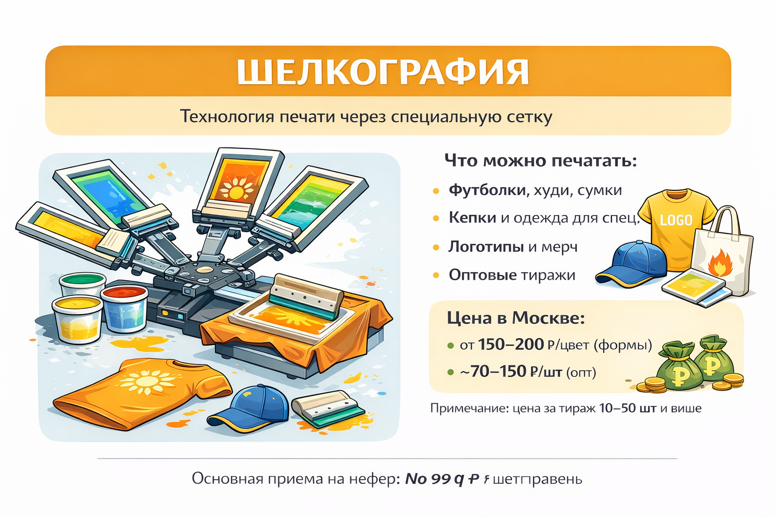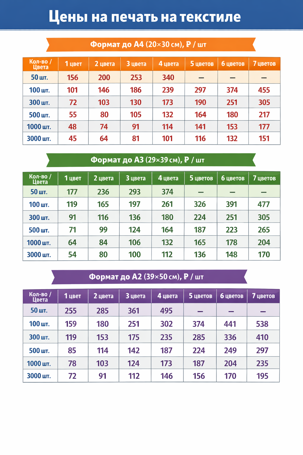 - футболки/текстиль: обычно от ~200–230 ₽ за принт A4; диапазон от ~100 до 1800 ₽/шт (зависит от формата/ткани/сложности)